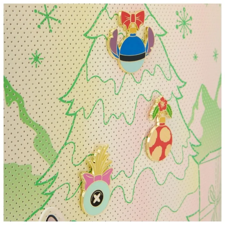 El diseño cuenta con un fondo iridiscente y un patrón festivo que destaca en cualquier lugar. Incluye un asa superior y una correa ajustable para mayor comodidad. Este producto con licencia oficial Disney es un regalo ideal para los fanáticos de Lilo & Stitch que desean celebrar la temporada con estilo.