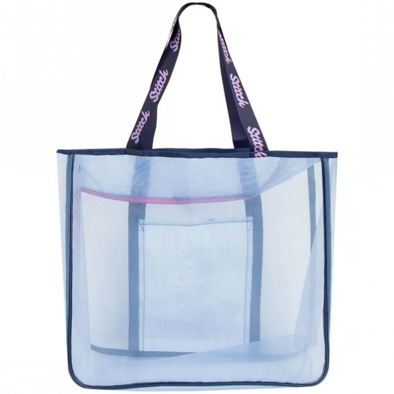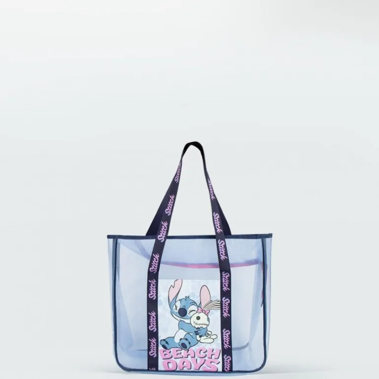 Confeccionada en 100% poliéster, esta bolsa no solo es resistente sino también ligera, ideal para llevar todos los esenciales playeros sin esfuerzo. Sus asas están diseñadas con la palabra ‘Stitch’ repetida en color rosa sobre un fondo oscuro, añadiendo un toque especial y distintivo.