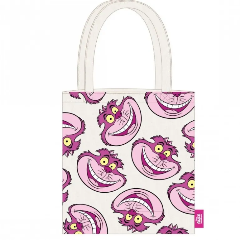 Descubre la bolsa shopping Disney Alicia en el País de las Maravillas, un complemento perfecto para los amantes de este clásico animado. La bolsa destaca por su diseño en tonos rosas, que muestra múltiples ilustraciones del icónico personaje del Gato de Cheshire, conocido por su sonrisa enigmática y encantadora. Fabricada con un 70% de poliéster y un 30% de algodón, ofrece una combinación ideal de durabilidad y tacto suave.