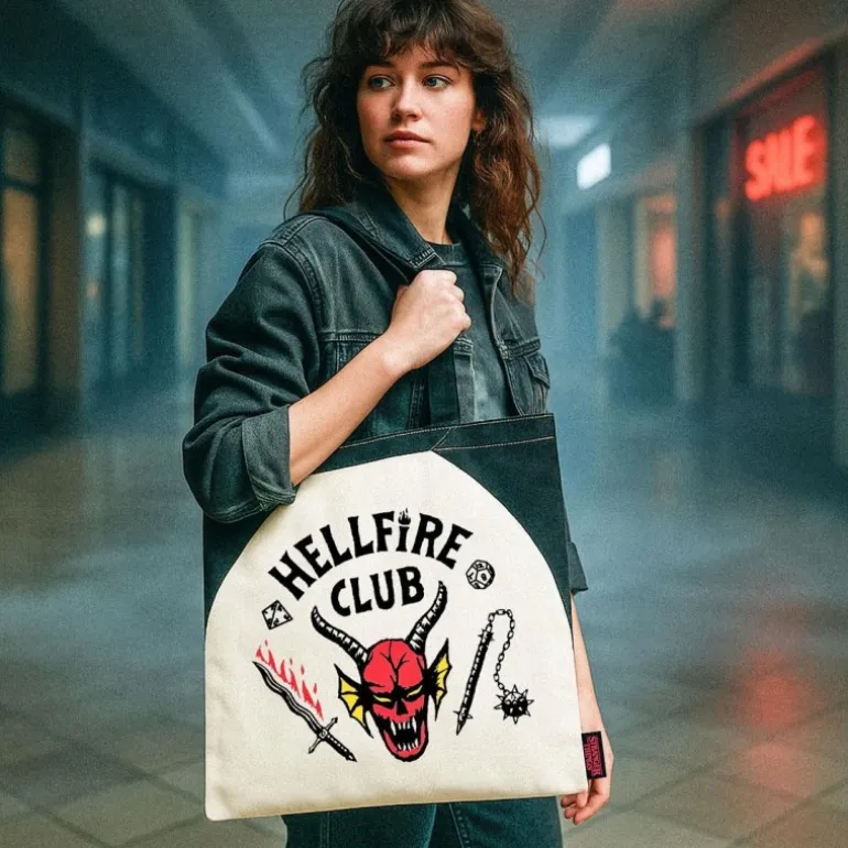 Explora el mundo de Stranger Things con esta exclusiva bolsa de compras del Hellfire Club. Esta bolsa combina estilo y funcionalidad con un diseño único que destaca por su estampado central, mostrando un demonio rojo con cuernos y detalles en negro y amarillo. Hecha de un duradero y cómodo material compuesto por 70% poliéster y 30% algodón, es perfecta para tus compras diarias y como accesorio de moda.