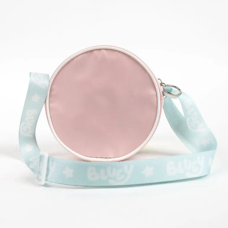 La parte frontal del bolso destaca por su tonalidad celeste y un borde suave en color rosa, lo que le aporta un toque delicado y divertido. Está fabricado en 100% poliéster, garantizando durabilidad y resistencia al uso diario. La correa ajustable, en un tono azul claro, incluye el nombre de Bluey y estrellitas, añadiendo un detalle adorable y funcional para los niños.