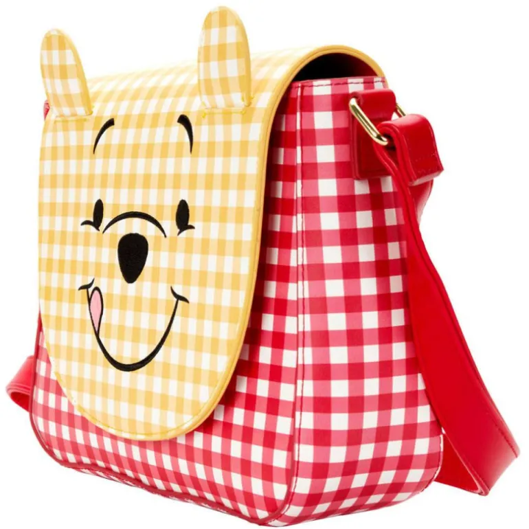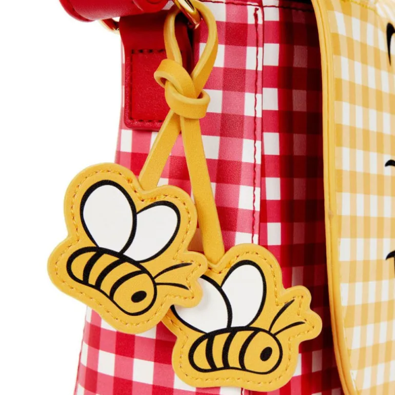 Pero sin duda lo más sorprendente es su diseño, con un estampado de cuadros, como los típicos manteles de pic-nic, y la carita de Winnie the Pooh en la parte delantera, tan adorable como siempre y relamiéndose porque está a punto de degustar su comida favorita, la miel. No te pierdas los cuidados detalles de este bolso, como los colgantes con forma de abeja, las partes bordadas en hilo o el estampado de su interior, donde aparecen el resto de amigos de Winnie the Pooh.