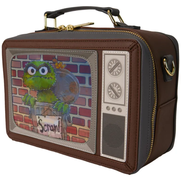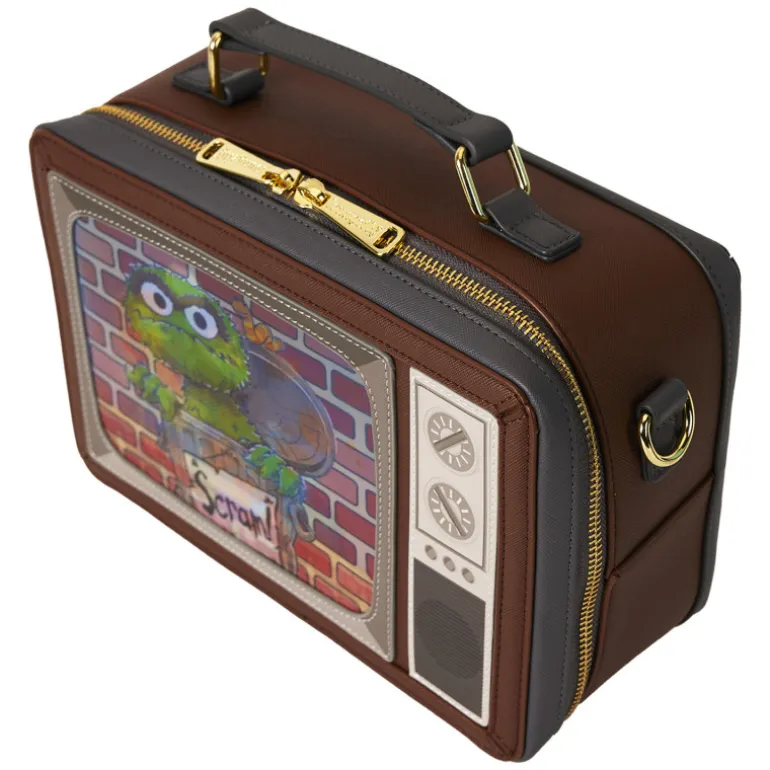 Este bolso bandolera de la marca Loungefly es un homenaje a los nostálgicos del mundo televisivo clásico. Diseñado en forma de una televisión vintage, el bolso presenta en su cara frontal una imagen colorida de Óscar El Gruñón junto a Tricky, El Monstruo de las Galletas, sobre un fondo de ladrillo simulado que evoca al famoso entorno de Plaza Sésamo.