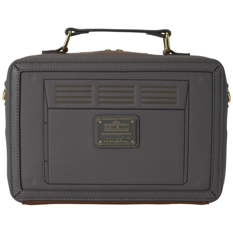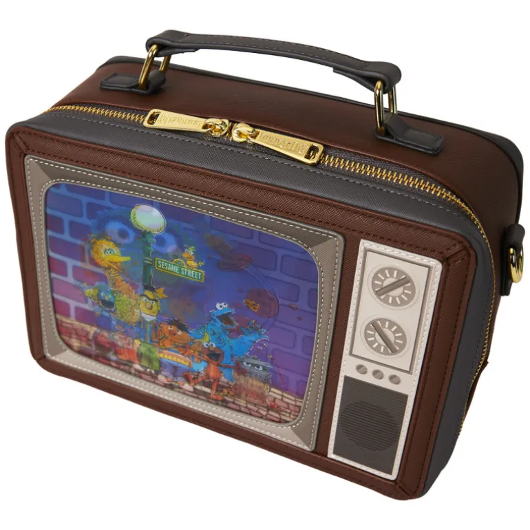 El bolso está confeccionado con materiales de alta calidad, con detalles en tonos marrones y grises que refuerzan su apariencia retro. En la parte posterior, se aprecia un diseño que imita los detalles traseros de una televisión antigua, incluyendo una placa con el logotipo de Sesame Street y Loungefly. Los cierres de cremallera dorados y la correa ajustable añaden funcionalidad y estilo.
