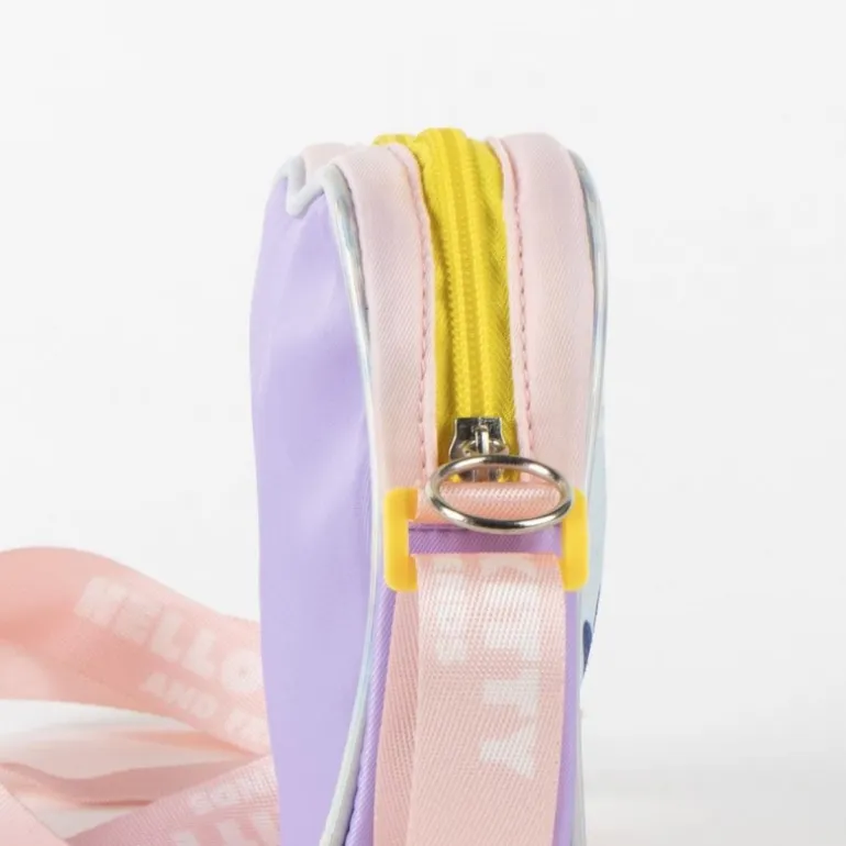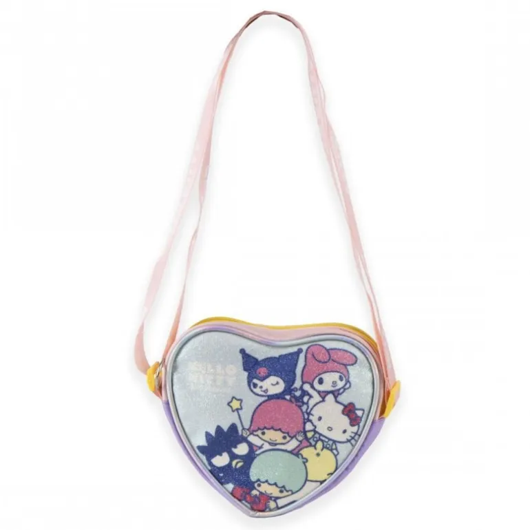La cremallera amarilla asegura que tus pertenencias estén seguras, mientras que la correa ajustable con el texto ‘Hello Kitty and Friends’ añade un toque personalizado y cómodo. El bolso ofrece suficiente espacio para guardar lo esencial de cualquier pequeño fan.