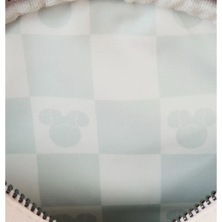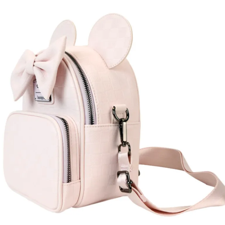 Descubre el encantador bolso mochila convertible de Minnie Mouse, una pieza única de Loungefly con diseño oficial de Disney. Este elegante accesorio presenta un delicado color crema con un patrón de cuadros, destacando unas orejas icónicas de Minnie en la parte superior y un lazo a juego que añade un toque distintivo.
