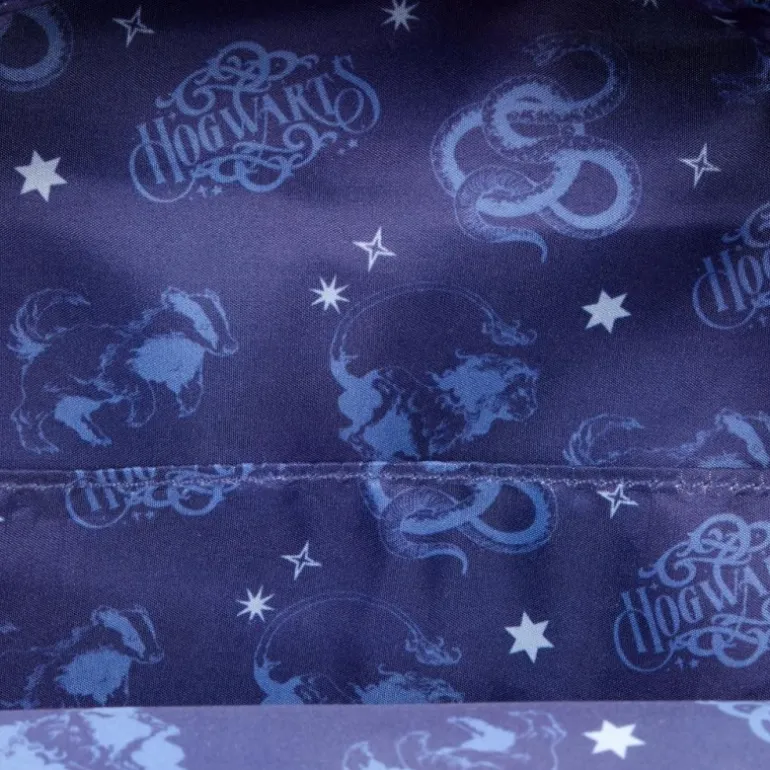 El diseño en denim azul incluye detalles bordados con los escudos de Hogwarts, así como motivos icónicos de la saga. Su estructura compacta y funcional es ideal para guardar tus pertenencias de manera segura y organizada, mientras que su acabado en cuero PU le añade un toque sofisticado. Además, cuenta con la licencia oficial de Warner Bros, lo que garantiza su autenticidad y exclusividad.