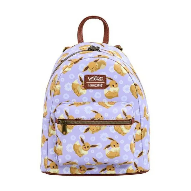 Descubre esta encantadora mochila Loungefly, perfecta para los amantes de Pokémon. Su diseño presenta un patrón de miniaturas de Eevee sobre un fondo lila suave, destacando la ternura de este popular personaje. Los detalles, como las cremalleras doradas y el logotipo de Pokémon en la parte frontal, le aportan un toque elegante.