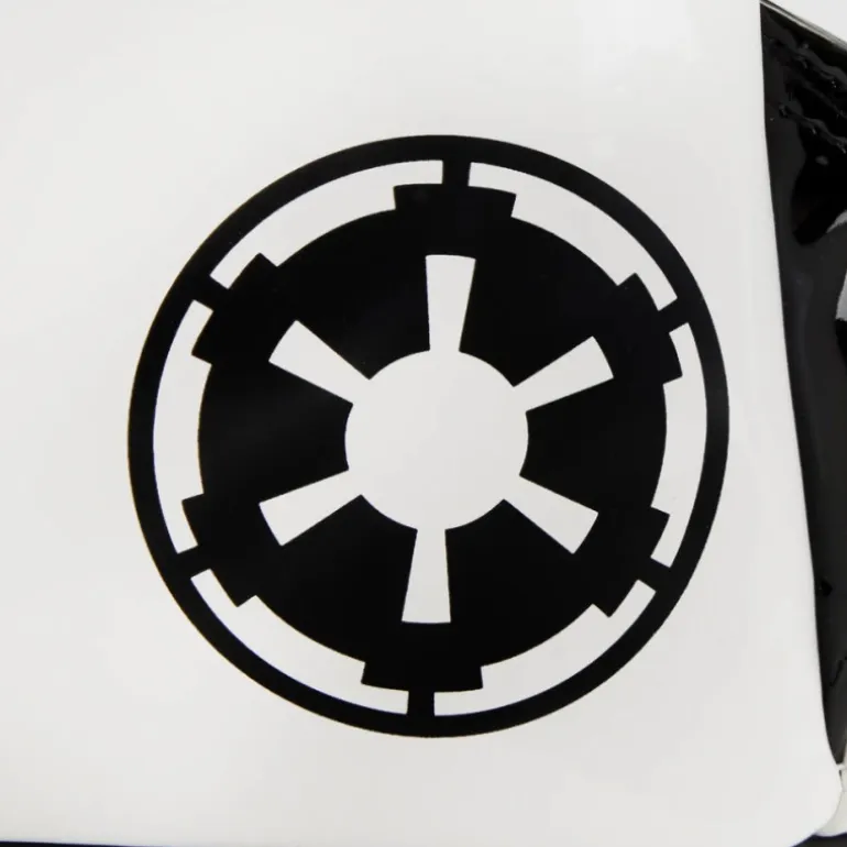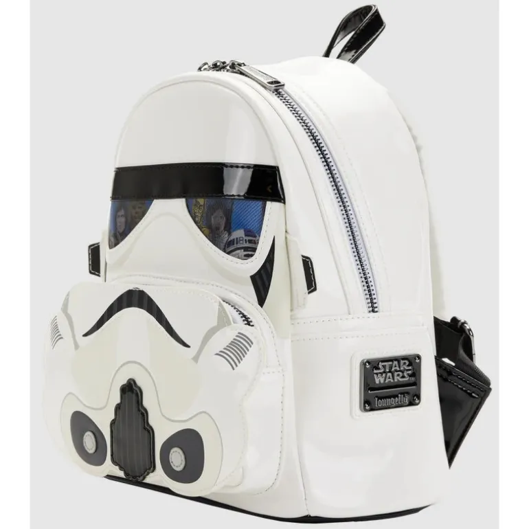Y sobre todo no te pierdas su original diseño, porque tiene la forma de este mítico casco de Stormtrooper, con todos los detalles del original, y además la imagen lenticular en la parte de los ojos, en la que parece que se reflejan Leia, R2-D2, C3PO, Han Solo, Chewbacca…. Y fíjate en sus cuidados detalles, como el estampado de su interior tan llenos de color, o la cremallera con la forma del símbolo del Imperio Galáctico.