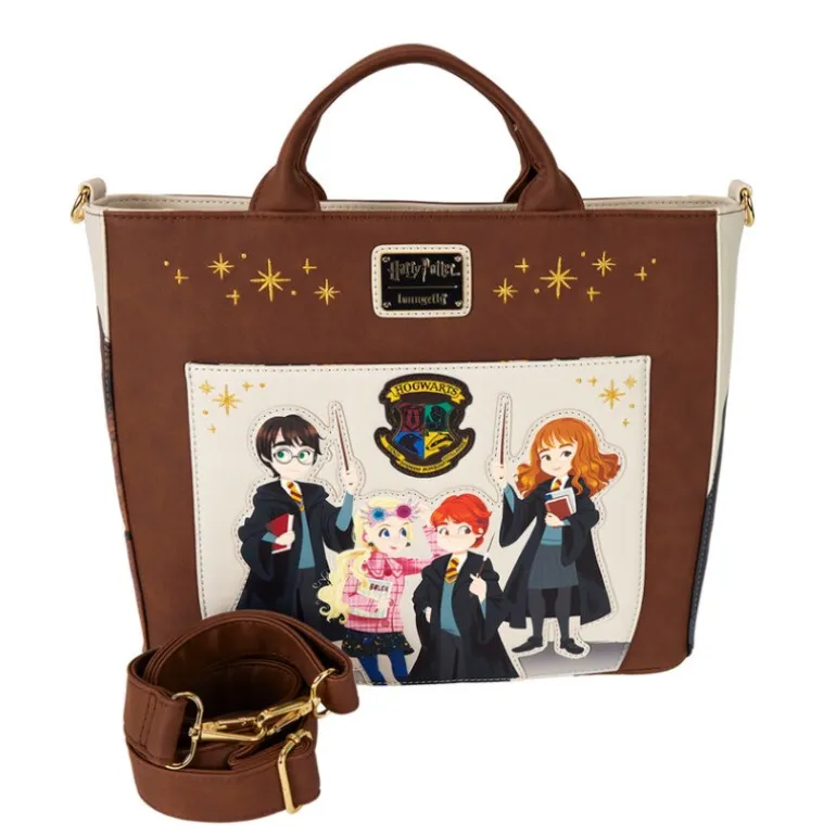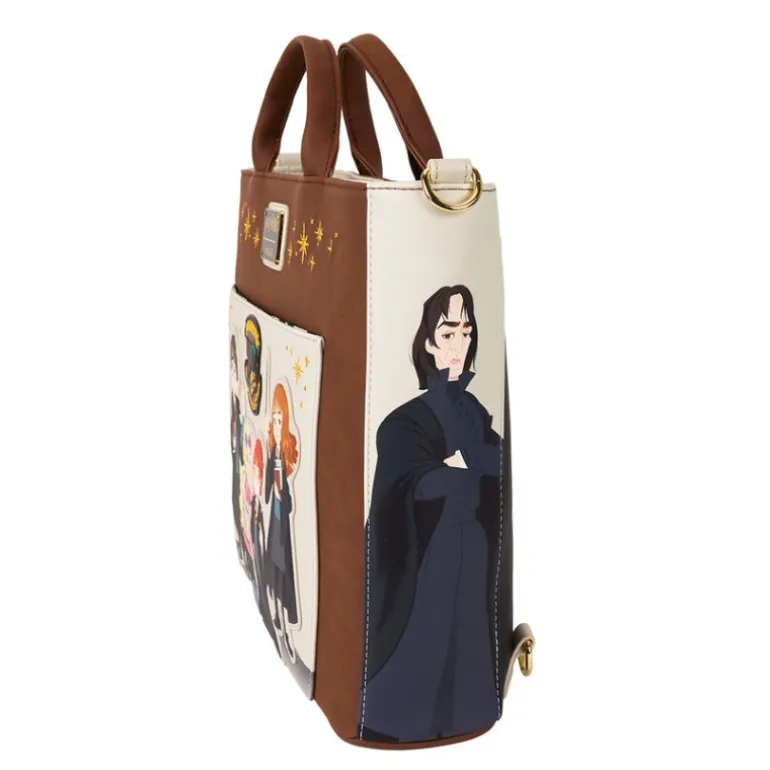Este bolso tote convertible de Harry Potter es un artículo imprescindible para cualquier admirador del mundo mágico. Con un diseño encantador y lleno de detalles, este producto con licencia oficial de Loungefly presenta ilustraciones vibrantes de personajes icónicos de la saga.