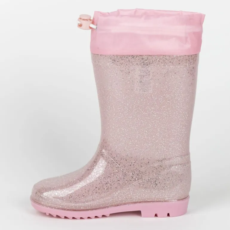 Descubre las encantadoras botas de lluvia Princess, ideales para las amantes de los cuentos y aventuras. Estas botas presentan un diseño mágico en color rosa con un toque de brillo que hará las delicias de las más pequeñas. En el lateral, destacan las ilustraciones de tres icónicas princesas, agregando un toque de fantasía y diversión a los días lluviosos.