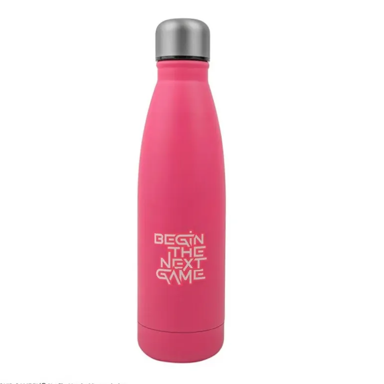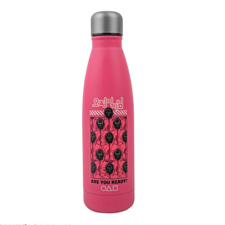 La botella isotérmica Guards inspirada en Squid Game es un accesorio esencial para los seguidores de esta serie de éxito. Con un vibrante color rosa, su diseño destaca por figuras geométricas negras representando a los icónicos guardias. En la parte superior, se puede leer «Are you ready?», una invitación directa a sumergirse en el universo de la serie.