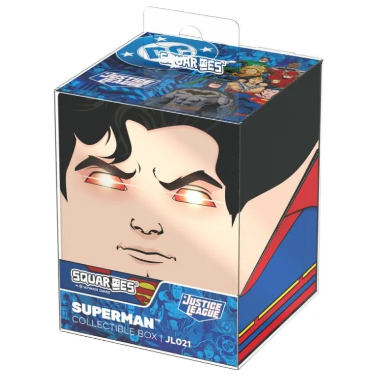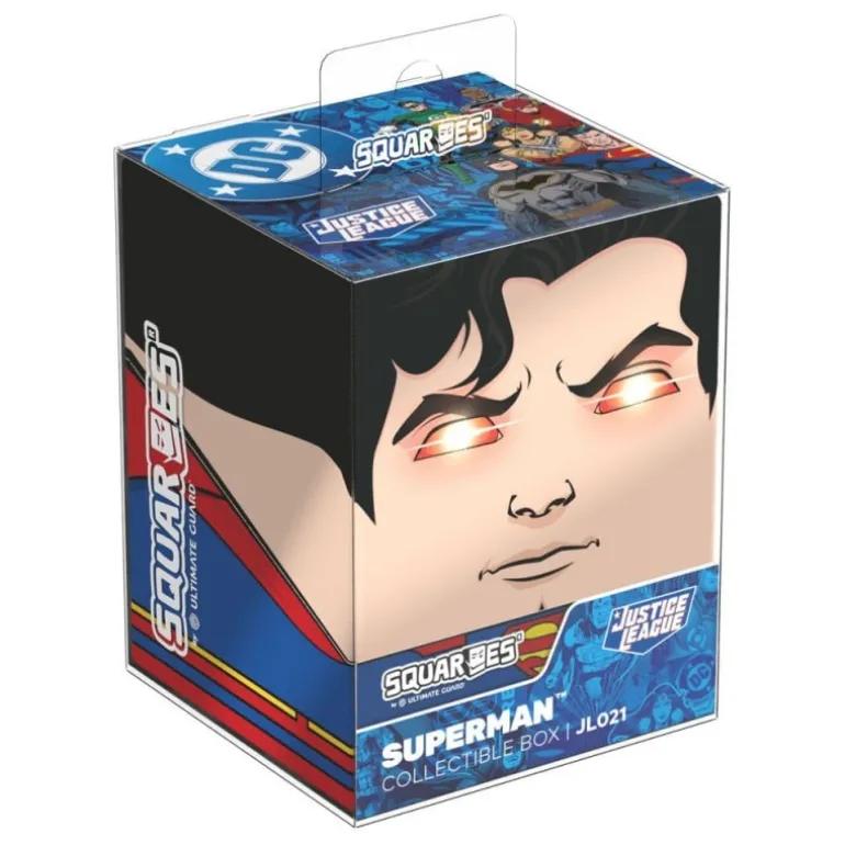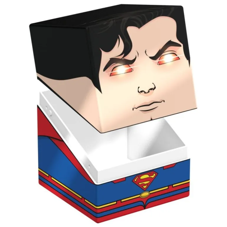 El diseño cuadrado presenta una impresión completa de Superman™, con un detalle llamativo: ojos que simulan emitir energía. Es una pieza que destaca por su apariencia robusta y su versatilidad. Con capacidad para hasta 100 cartas con fundas dobles o 120 con fundas simples, es una opción excelente para cualquier fanático del coleccionismo.