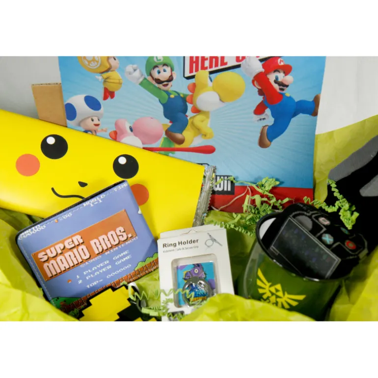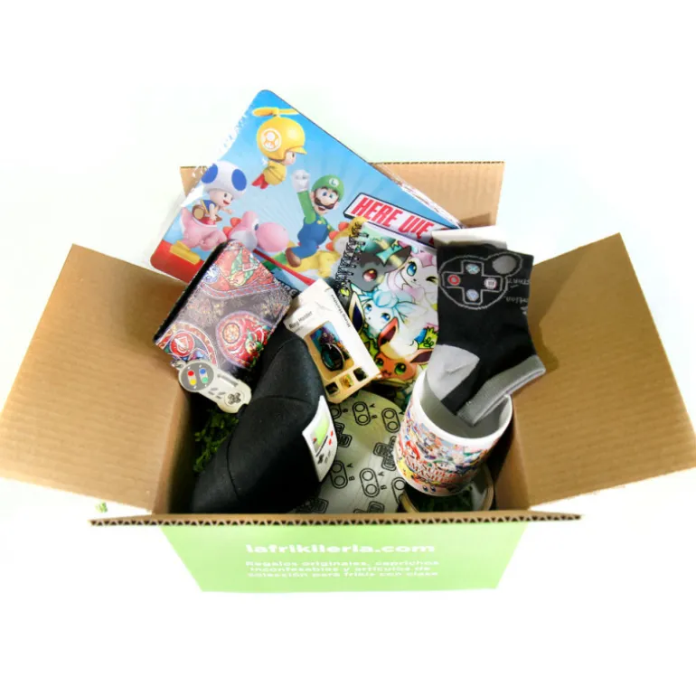 Está llena hasta arriba de cosas de videojuegos para gamers de hoy, ayer y siempre. Todo lo que tenemos en nuestras categorías de videojuetos de y que nos quepa en la caja puede caerte en esta caja sorpresa tan molona: tal vez una gorra Nintendo, o unas zapas de casa de Super Mario o unos snacks de Pokemon o tal vez alguna cartera de God of War o unos boxer de Fallout o alguna taza de Zelda…tooooodo.