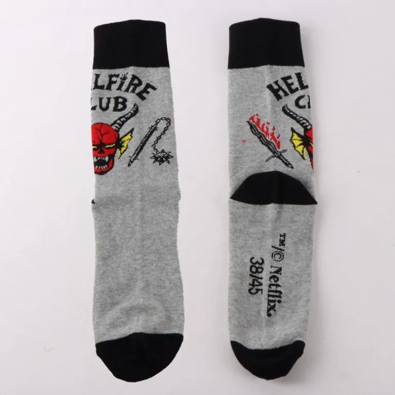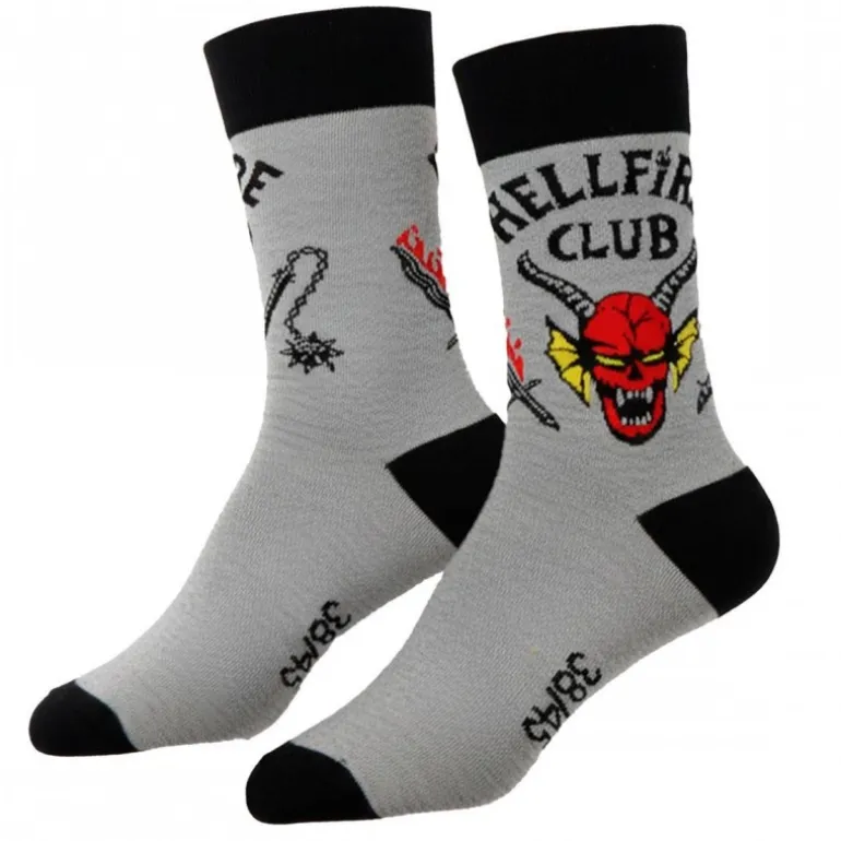 Descubre los calcetines Hellfire Club de Stranger Things, el complemento ideal para los verdaderos fans de esta emblemática serie de Netflix. Estos calcetines en color gris claro destacan por su diseño vibrante con el logo del Hellfire Club, caracterizado por un demonio rojo y detalles en negro y amarillo. Fabricados con un 86% de algodón, 12% de poliamida y 2% de elastano, ofrecen una comodidad y ajuste excepcionales.
