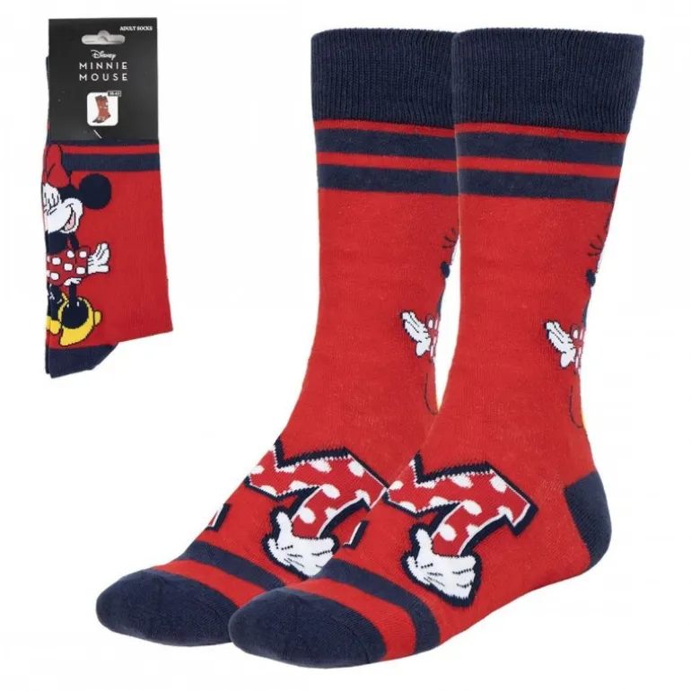 Descubre estos encantadores calcetines de Minnie Mouse, perfectos para añadir un toque de diversión a tu vestuario diario. Estos calcetines presentan un diseño vibrante con un adorable estampado de Minnie en un fondo rojo intenso, acentuado por detalles en negro y blanco. Las líneas horizontales en la parte superior añaden un toque moderno al diseño.