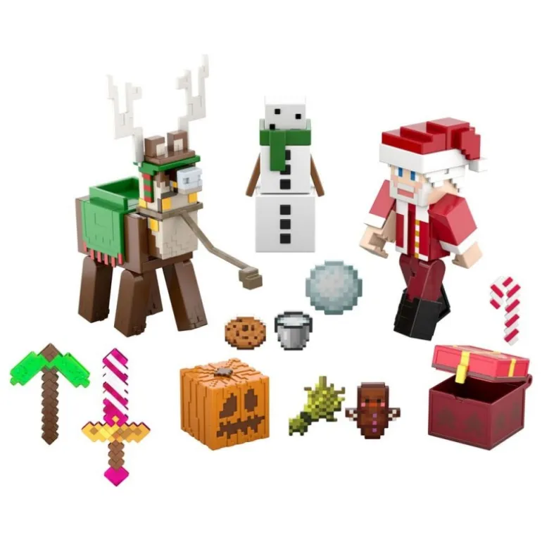 Este calendario incluye 3 figuras de acción de 8,25 cm: Papá Noel, la Llama Jolly y un Golem de Nieve, así como 17 accesorios detallados, entre los que encontrarás un sombrero, un abrigo, y botas de Papá Noel, una bola de nieve, una galleta, leche, una bufanda, una espada, y mucho más. Cada pieza está diseñada con la estética pixelada característica del juego, lo que hace que estas figuras sean perfectas para coleccionistas y fanáticos del juego.