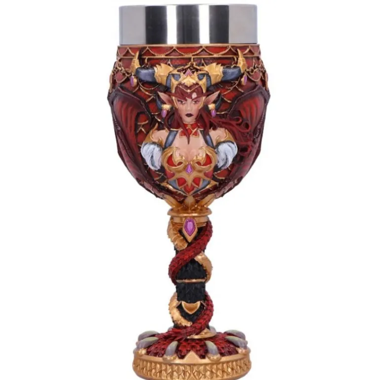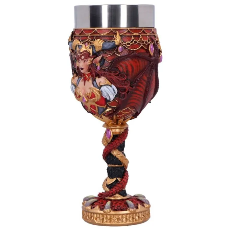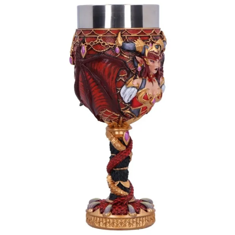 El diseño del cáliz presenta a Alexstrasza con un impresionante nivel de detalle, desde las alas hasta las intrincadas joyas que adornan su figura. El cáliz está montado sobre una base que simula texturas de escamas y elementos dorados, con una serpiente que envuelve elegantemente el tallo. Además, se ha utilizado un inserto de acero inoxidable en el interior para garantizar su funcionalidad y durabilidad.