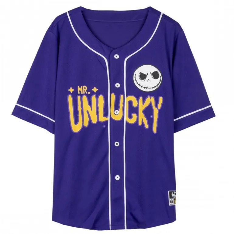 Descubre la camiseta corta de béisbol inspirada en Nightmare Before Christmas (Pesadilla Antes de Navidad de Tim Burton). Este producto destaca por su vibrante color morado y su diseño de estilo béisbol, adornado con ribetes blancos que realzan su estilo deportivo. En el frente, luce un gráfico llamativo con la frase «Mr. Unlucky» en letras amarillas, acompañada de un diseño icónico que recuerda a Jack Skellington.