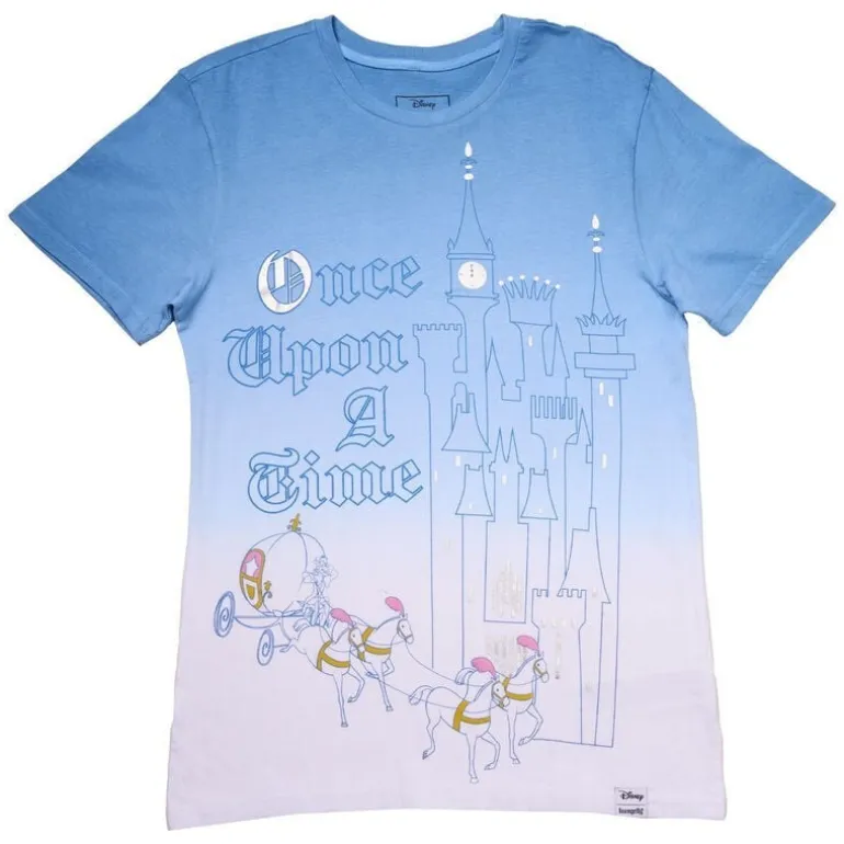 Descubre esta camiseta de manga corta con diseño especial por el 75 aniversario de Cenicienta. Su color azul gradiente evoca la magia del cuento, mientras que la ilustración del castillo y el carruaje en tonos suaves te transportan al mundo de fantasía de Disney. Con la frase «Once Upon A Time» en un delicado azul, esta camiseta es un homenaje perfecto para los amantes de los cuentos de hadas.
