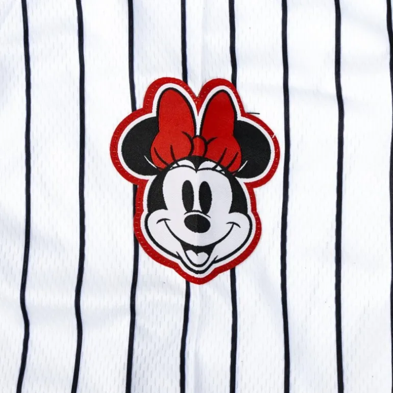 Descubre la camiseta corta estilo baseball de Minnie, perfecta para los amantes de Disney y de un look casual y moderno. Esta camiseta destaca por su diseño de rayas verticales blancas y negras, evocando el clásico uniforme de béisbol. En el frente, el nombre «Minnie» se presenta en letras rojas y negras, mientras que el número «28» añade un toque deportivo especial.