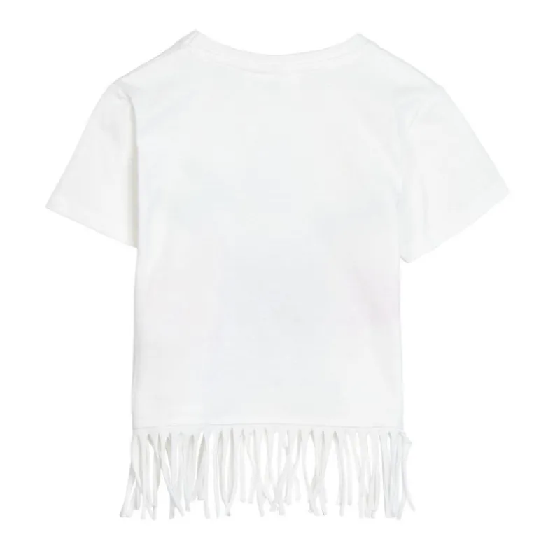 Descubre la camiseta corta de Stitch, perfecta para los más pequeños amantes de Disney. Esta prenda destaca por su diseño vibrante y divertido, con el querido personaje Stitch en el centro, rodeado de letras coloridas que forman la palabra «Aloha». La camiseta presenta detalles únicos como un borde inferior con flecos blancos que añade un toque moderno y juguetón.