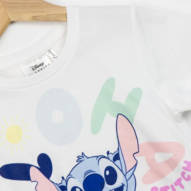 Descubre la camiseta corta de Stitch, perfecta para los más pequeños amantes de Disney. Esta prenda destaca por su diseño vibrante y divertido, con el querido personaje Stitch en el centro, rodeado de letras coloridas que forman la palabra «Aloha». La camiseta presenta detalles únicos como un borde inferior con flecos blancos que añade un toque moderno y juguetón.