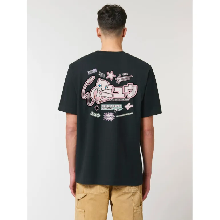 La camiseta presenta un fondo negro en el que resalta el dibujo de un adorable Mew, que con sus tonos rosados contrasta muchísimo.