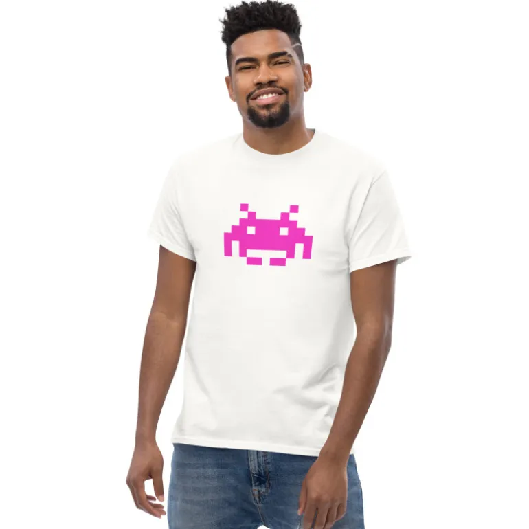 Descubre la camiseta definitiva para los amantes de los videojuegos retro con esta impresionante prenda de Space Invaders. Presenta un diseño icónico de un marcianito en color rosa vibrante en el centro del pecho, capturando la esencia clásica de los arcades. El fondo blanco de la camiseta resalta el diseño pixelado, añadiendo un toque de nostalgia y estilo.