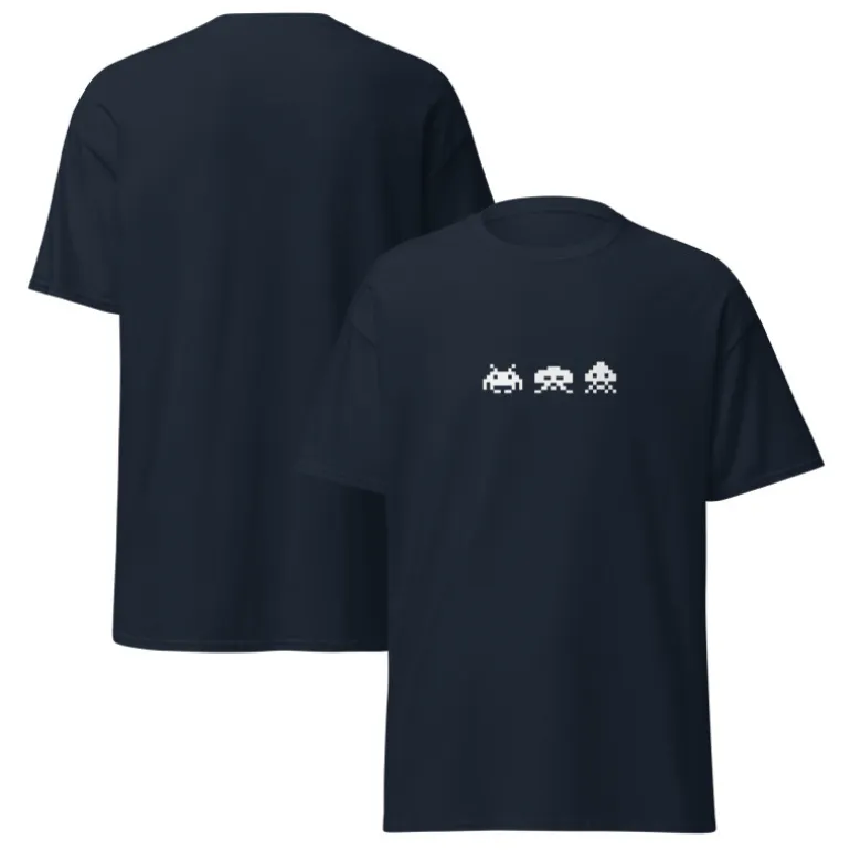 Descubre la camiseta perfecta para los amantes de los videojuegos clásicos. Esta prenda destaca por su diseño minimalista con los icónicos tres marcianitos del Space Invaders, impresos en blanco sobre un fondo azul oscuro. Los gráficos pixelados evocan el estilo retro de las salas de arcade, haciendo de esta camiseta un complemento esencial para cualquier fanático de los juegos vintage.