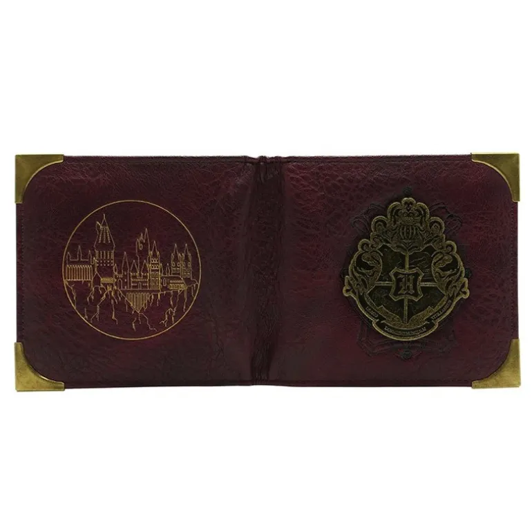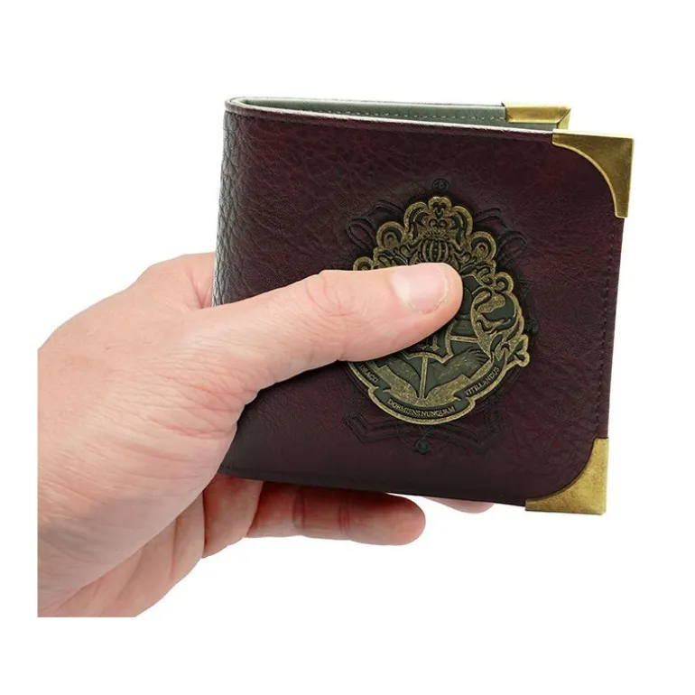Mide aproximadamente 11 x 9,5 cm cuando está cerrada y tiene un fantástico diseño, protagonizado por el escudo de armas del famoso colegio Hogwarts, perfectamente reproducido en metal tipo envejecido, que combina estupendamente con la superficie de piel sintética marrón, sin usar materiales de origen animal en su fabricación. Por dentro tiene varios compartimentos, ideal para billetes, tarjetas… Pero también un compartimento cerrado para monedas, que además tiene el aspecto de la clásica carta de Hogwarts, con el lacre y todo.