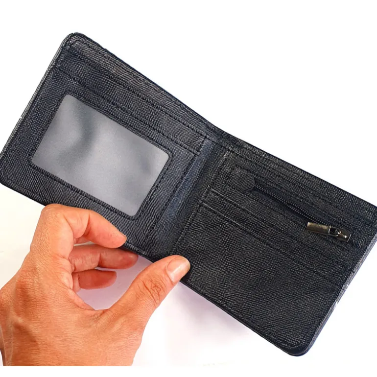 Mide aproximadamente 11 x 9 cm y cuenta con varios compartimentos para que lleves todo bien ordenadito. Es ideal para billetes y tarjetas, pero también tiene un compartimentos especial para monedas. Está fabricada con una combinación de texturas y materiales utilizando piel sintética, pero sin la utilización de piezas o componentes de origen animal.