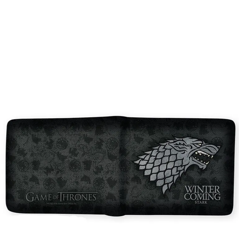 Una cartera genial la mires por donde la mires!! Por fuera tiene en un lado el Huargo de los Stark con el moto de la casa: «Winter is Coming» y por el otro el logo que sale en la intro de la serie Game of Thrones (Juego de Tronos). Todo ellos en los clásicos carácteres cromados con la tipografía que tan popular se ha hecho con el éxito de la serie de HBO.