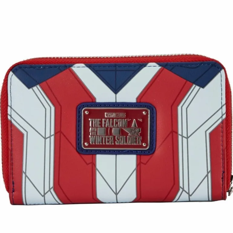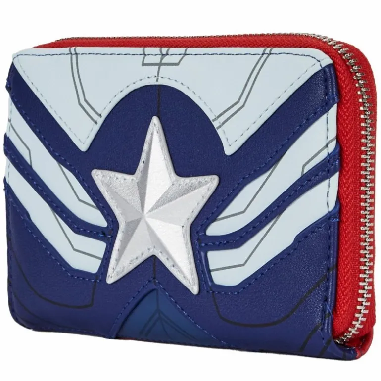 Descubre la increíble cartera Loungefly inspirada en Marvel Falcon Capitán América. Este accesorio único presenta un diseño llamativo con detalles bordados y apliques que evocan el icónico traje del Capitán América. Realizada en piel sintética, su resistente cremallera roja asegura tus pertenencias, mientras que su interior ofrece compartimientos prácticos para tarjetas y documentos.
