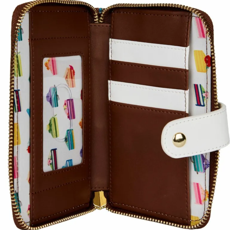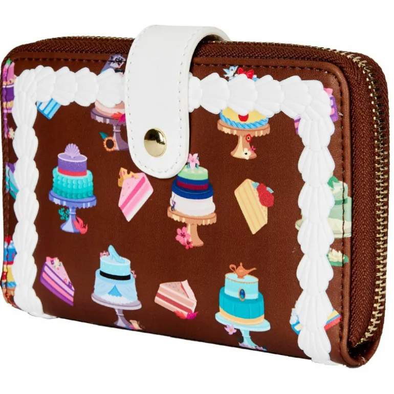 Pero sin duda lo más sorprendente es su diseño, en marrón chocolate y con un montón de pastelitos de aspecto muy cuqui y delicioso. Pero además, sí te fijas bien, coronando estos pasteles hay algún objeto icónico de las pelis Disney: la lámpara mágica de Aladdín, el zapato de Cenicienta, la manzana de Blancanieves… Entre muchos otros. No te pierdas los cuidados detalles de esta cartera, como el estampado de su interior.