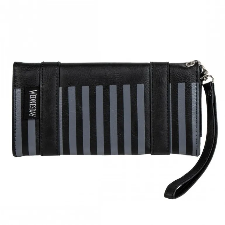 Descubre la elegancia oscura con esta cartera de polipiel inspirada en «Wednesday». Diseñada en un sofisticado color negro, su exterior presenta un escudo distintivo en el centro, acompañado por dos correas con hebillas metálicas que aportan un toque gótico y distinguido. Las franjas gris oscuro añaden un contraste visual llamativo, convirtiéndola en un accesorio único y con carácter.