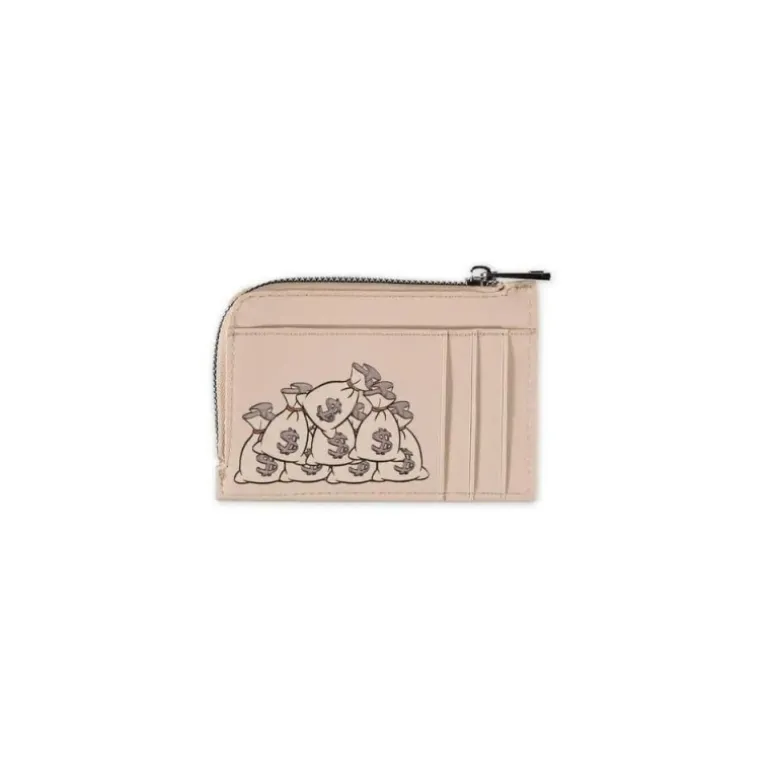 Con un color beige predominante, la cartera incluye varios compartimentos para tarjetas y un bolsillo con cremallera, asegurando funcionalidad y estilo. En el reverso, se muestra una gráfica de sacos de dinero, completando un diseño que celebra la riqueza y la astucia del famoso personaje de Disney.