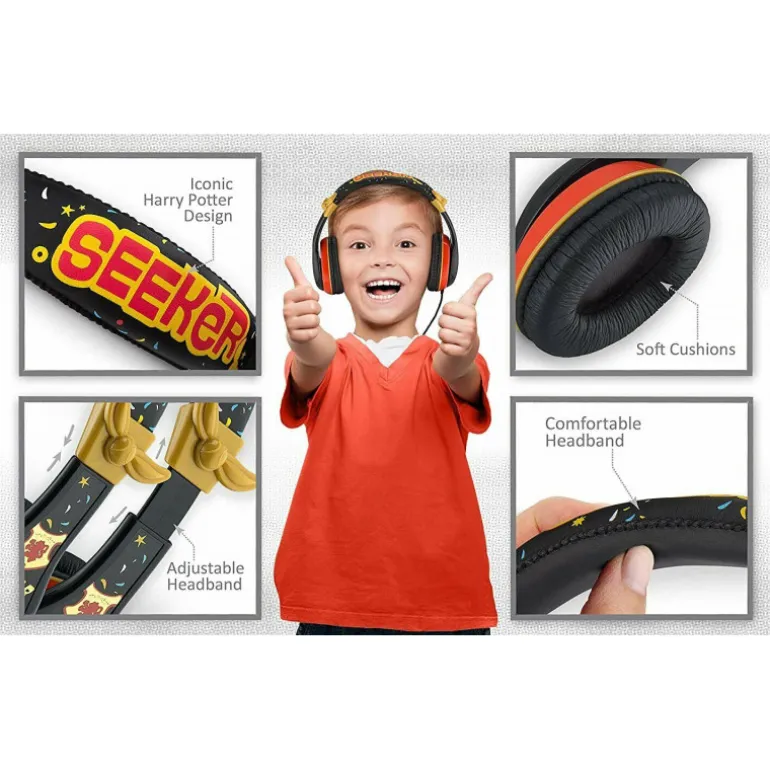 Son unos preciosos auriculares tipo diadema (también llamados «cascos») con una calidad de sonido fantástica y un cable con conector de 3,5 mm, por lo que podrás usarlo en la mayoría de dispositivos. Se han restringido a 85 dB y son adecuados y seguros para niños, porque además incluyen un controlar parental del volumen. Cuenta con una diadema acolchada ajustable con almohadillas suaves al tacto para mayor comodidad. Y lo mejor es que tiene un diseño realmente genial, con unos dibujos muy cuquis del propio Harry Potter montado en su escoba voladora y preparado para jugar al quidditch.