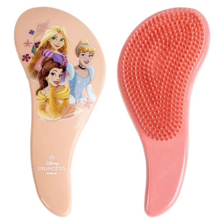 Con un atractivo color rosa, el cepillo presenta en su parte superior las adorables imágenes de las princesas de Disney: Rapunzel, Bella y Cenicienta, que sin duda capturarán la atención de los más pequeños. Su diseño ergonómico y suave permite un deslizamiento fácil a través del cabello, minimizando el dolor y evitando tirones, lo que hace que sea perfecto para el uso diario.