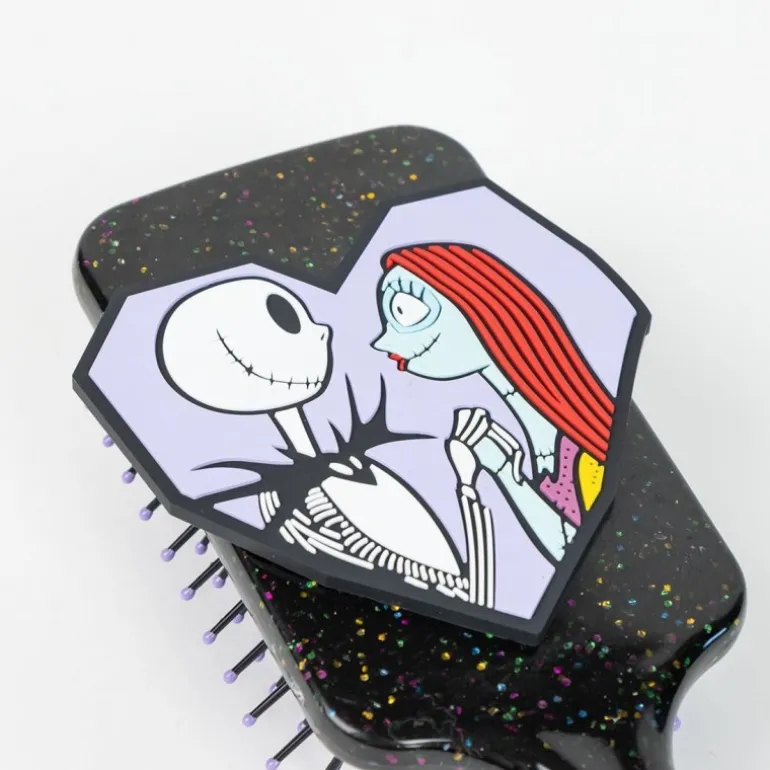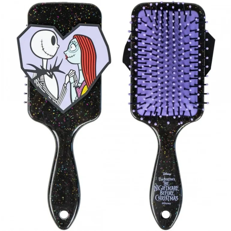 Este cepillo rectangular es un homenaje perfecto para los amantes de Nightmare Before Christmas. Con un diseño encantador en el que aparecen Jack Skellington y Sally, este cepillo no solo embellece tu rutina diaria, sino que también añade un toque de magia a tu tocador. El cuerpo del cepillo está fabricado en plástico ABS negro con acabado brillante y detalles de purpurina que evocan un cielo estrellado. Sus cerdas flexibles en color violeta están diseñadas para desenredar suavemente el cabello sin romperlo. Es una opción ideal tanto para coleccionistas como para quienes desean añadir un toque único a su cuidado personal diario. El cepillo viene en una elegante caja de presentación, perfecta para regalo.