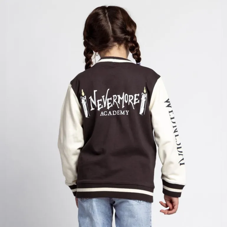 Descubre la elegante chaqueta baseball inspirada en «Wednesday», ideal para niños de 8 a 14 años. Confeccionada en 100% algodón, esta prenda garantiza comodidad y suavidad al contacto con la piel. Presenta un diseño en tonos negro y blanco, donde el cuerpo de la chaqueta es oscuro, contrastando con las mangas claras. El frente luce botones y un bordado en el pecho con el escudo de la famosa “Nevermore Academy”.