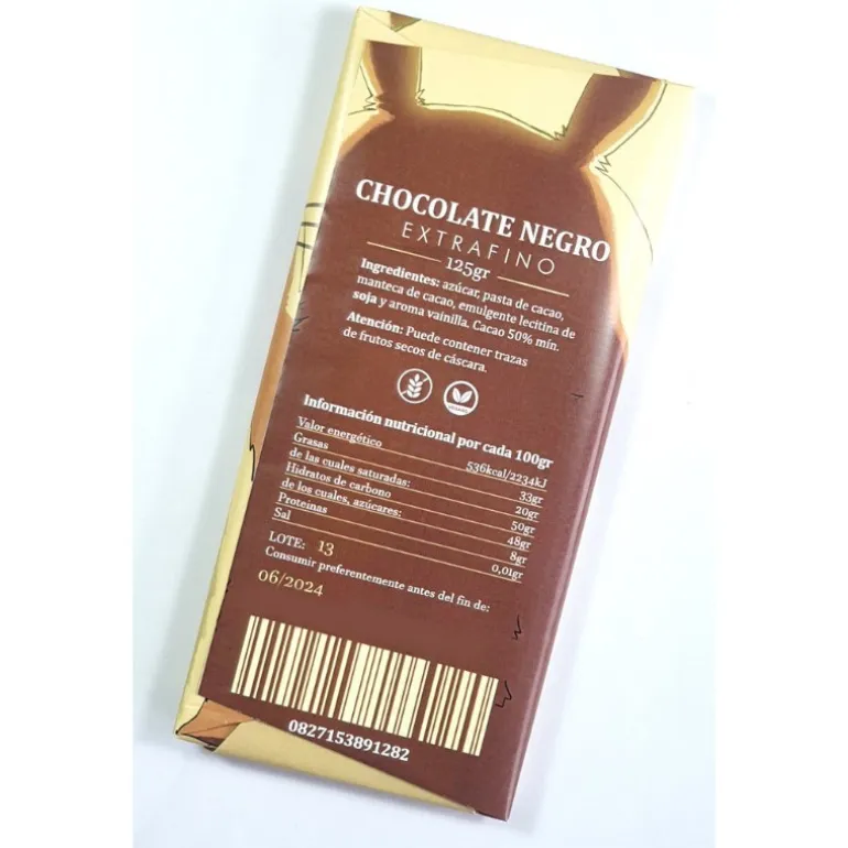 Ingredientes: Azúcar, pasta de cacao, manteca de cacao, emulgente (lecitina de SOJA) y aroma (vainillina). Cacao: 50% mínimo. Puede contener trazas de leche y derivados, cacahuetes y frutos de cáscara.