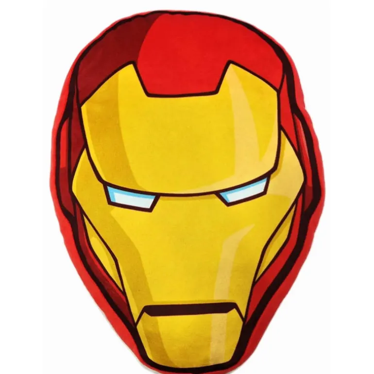 El cojín presenta un intenso color amarillo en el centro, representando el casco de Iron Man, rodeado por un borde de color rojo, típico del traje del superhéroe. Además, los detalles en negro añaden profundidad y definición al diseño, mientras que los ojos blancos le aportan un toque realista y heroico.
