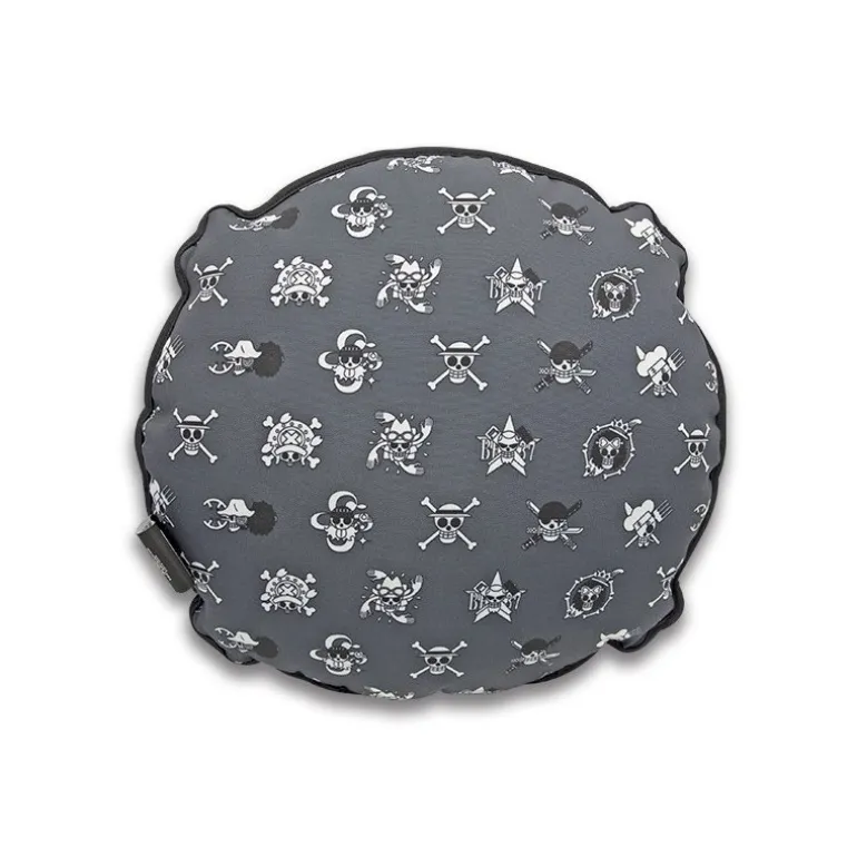 El cojín es un producto que cuenta con licencia oficial, una excelente calidad tanto en materiales como en acabados y un tacto realmente agradable. Tiene una media aproximada de 32 cm de diámetro y unos 8 cm de alto. Por lo mejor es su diseño con una perfecta reproducción de este símbolo pirata tan conocido, con detalles bordados en hilo primorosamente Y por la parte de atrás un precioso mosaico, muy elegante, con una montón de emblemas de esta mítica serie de anime.