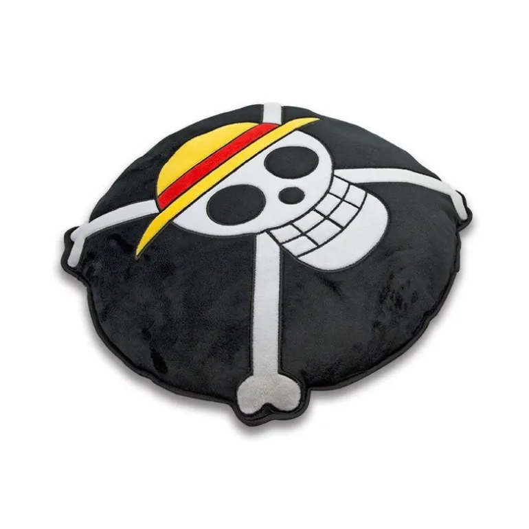 Un cojín mullidito con la forma de uno de los símbolos más célebres del mundo del manga y el anime, nada menos que el emblema de los Piratas del Sombrero de Paja de la genial serie One Piece.