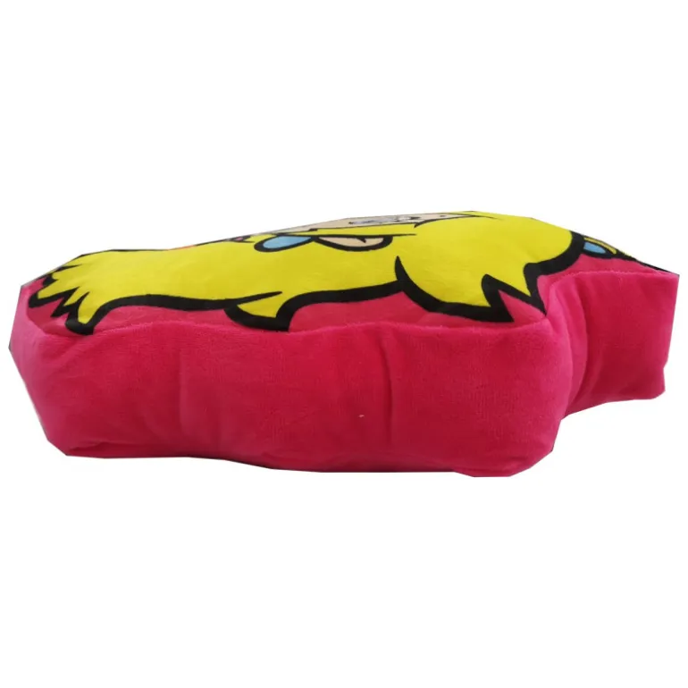 Este encantador cojín Peach es una pieza imprescindible para los amantes del universo de Super Mario Bros. Con un diseño que captura fielmente la imagen icónica de la princesa Peach, el cojín presenta una forma distintiva que sigue el contorno de su cabello y corona. Predomina un vibrante color amarillo en el cabello de Peach, complementado con un fondo rosa que resalta su expresión dulce y sus características faciales.