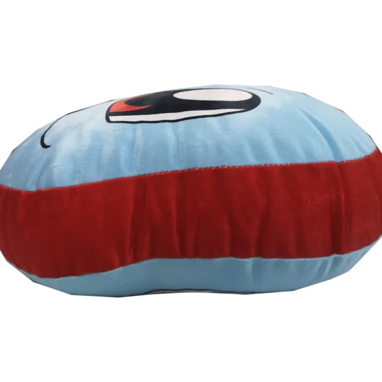El cojín tiene una forma circular con el rostro de Squirtle en un vibrante color azul, acompañado de detalles en negro y rojo en los ojos. El reverso presenta un borde en un llamativo color rojo que resalta su diseño único.