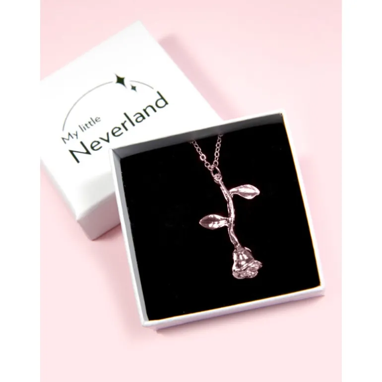 Se trata de un elegante colgante, con acabados rosados, que destaca por una pieza principal con la forma de la Rosa Encantada de La Bella y Bestia, recordando una de las objetos más emblemáticos de esta mágica historia de amor. Cuenta con unos acabados de gran calidad y los detalles más icónicos de esta rosa tan especial.