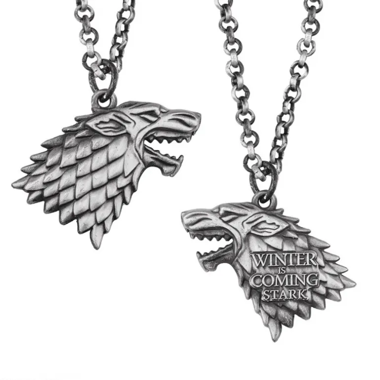 Descubre un exquisito collar Stark de edición navideña inspirado en Juego de Tronos. La pieza central de este conjunto es un colgante metálico con el icónico emblema del lobo huargo de la Casa Stark, acompañado de la célebre frase «Winter is Coming«. Este accesorio se presenta en una elegante cadena que complementa perfectamente su diseño robusto y detallado. El collar viene dentro de una esfera decorativa de color plateado, diseñada con exquisitos detalles que reflejan el prestigio y la historia de la casa Stark. La esfera, de 10 cm de diámetro, es perfecta para adornar tu árbol de Navidad, agregando un toque solemne y sofisticado a tus decoraciones. Este set de colección es un regalo ideal para cualquier amante de la serie, combinando la belleza de un accesorio de moda con el encanto decorativo de una pieza navideña única.