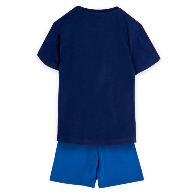 La camiseta es de un llamativo color azul marino, destacando con la imagen de Sonic en el centro y el nombre del personaje en letras grandes y amarillas. Los pantalones cortos, en azul brillante, cuentan con una cintura elástica ajustable con cordón para un ajuste perfecto, proporcionando libertad de movimiento.